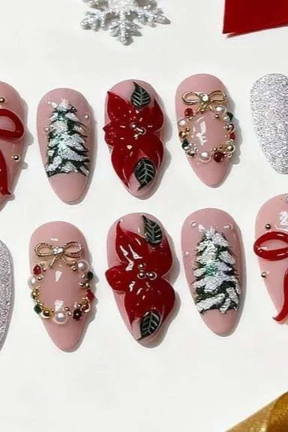 24pcs Christmas Press on Nails Medium Almond with 3D Design