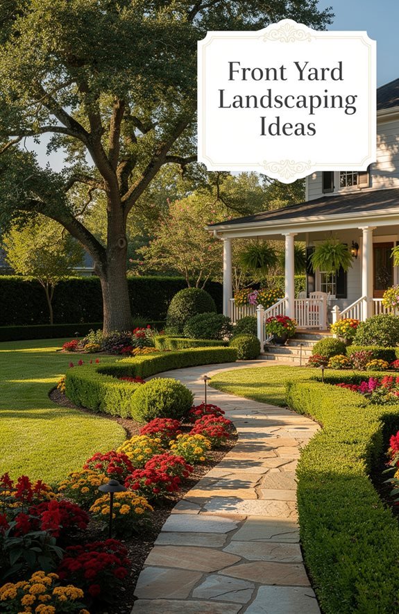 Transform your front yard into a enthralling showcase with vibrant native plants that enhance biodiversity. Experiment with bold flower bed designs, layering heights and textures for visual appeal. Create inviting pathways using natural materials like stone or gravel, adding lights for safety and charm. Don’t forget decorative features like sculptures or water elements to add personality. With a thoughtful approach, your yard can enchant everyone who passes by, opening up a world of possibilities for your space.