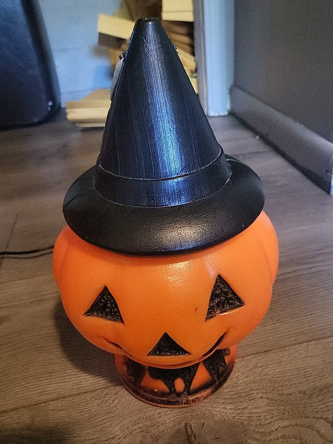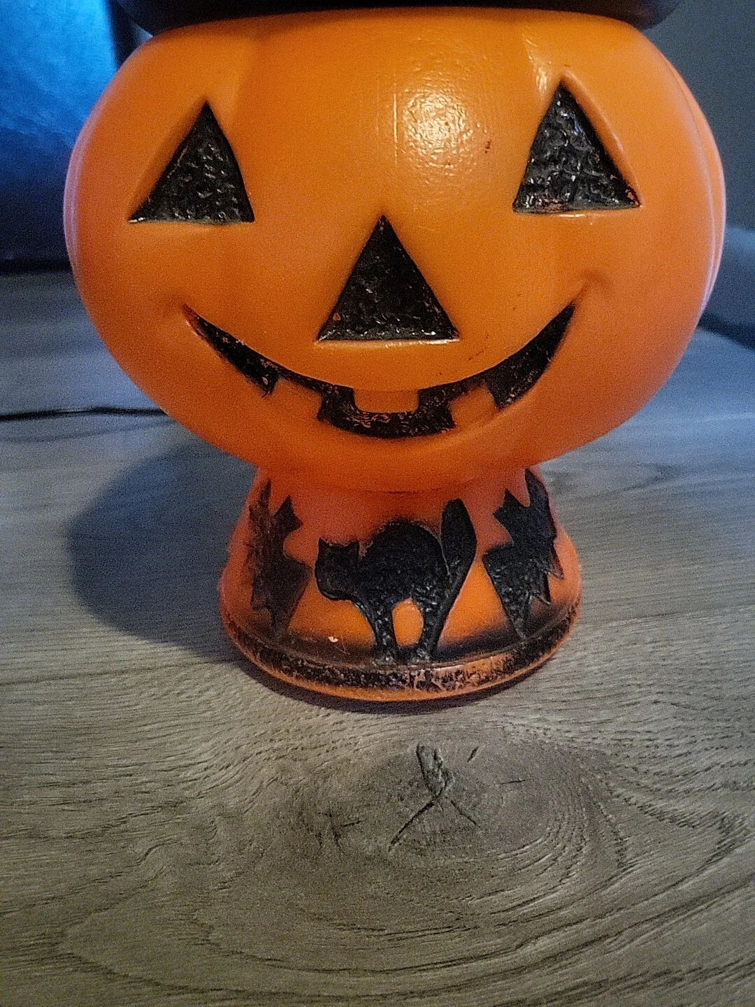 Vintage 1960s Pumpkin Jack O Lantern Witch Hat Black Cat Bats Blow Mold 13”