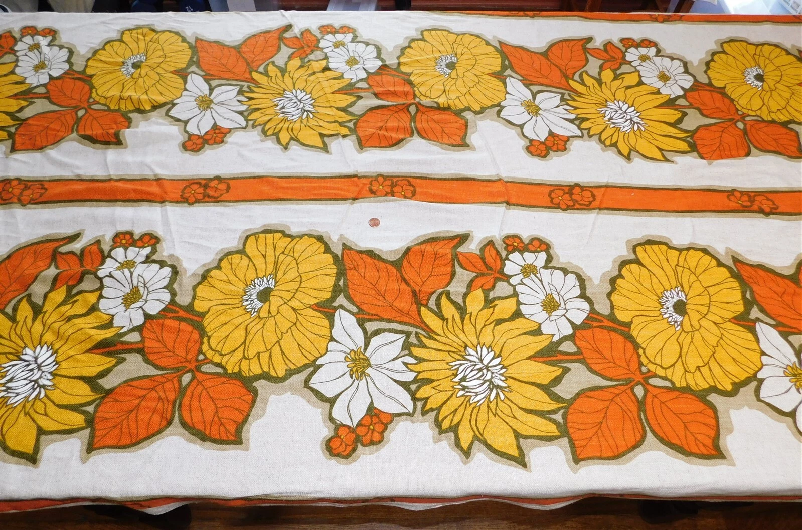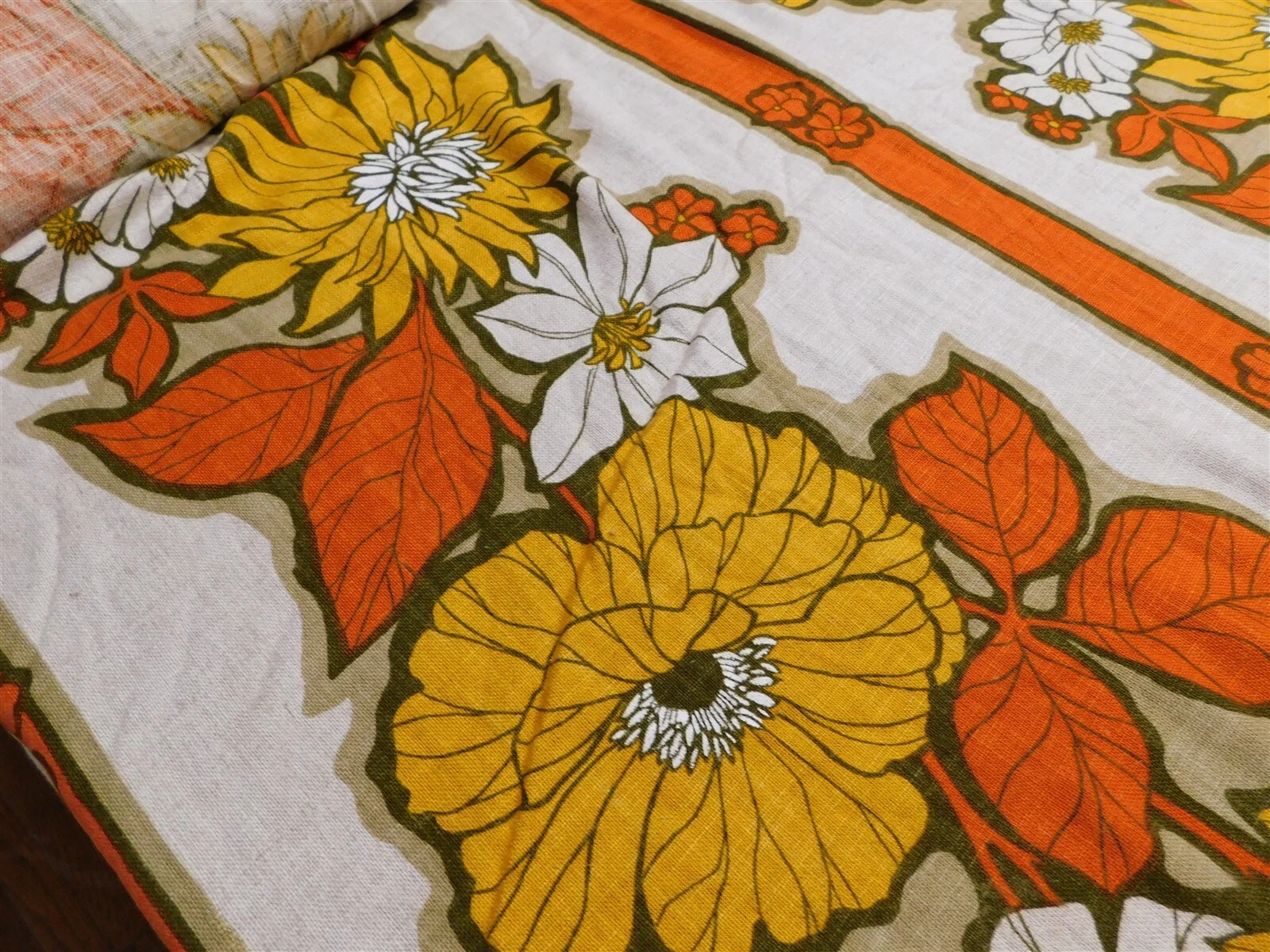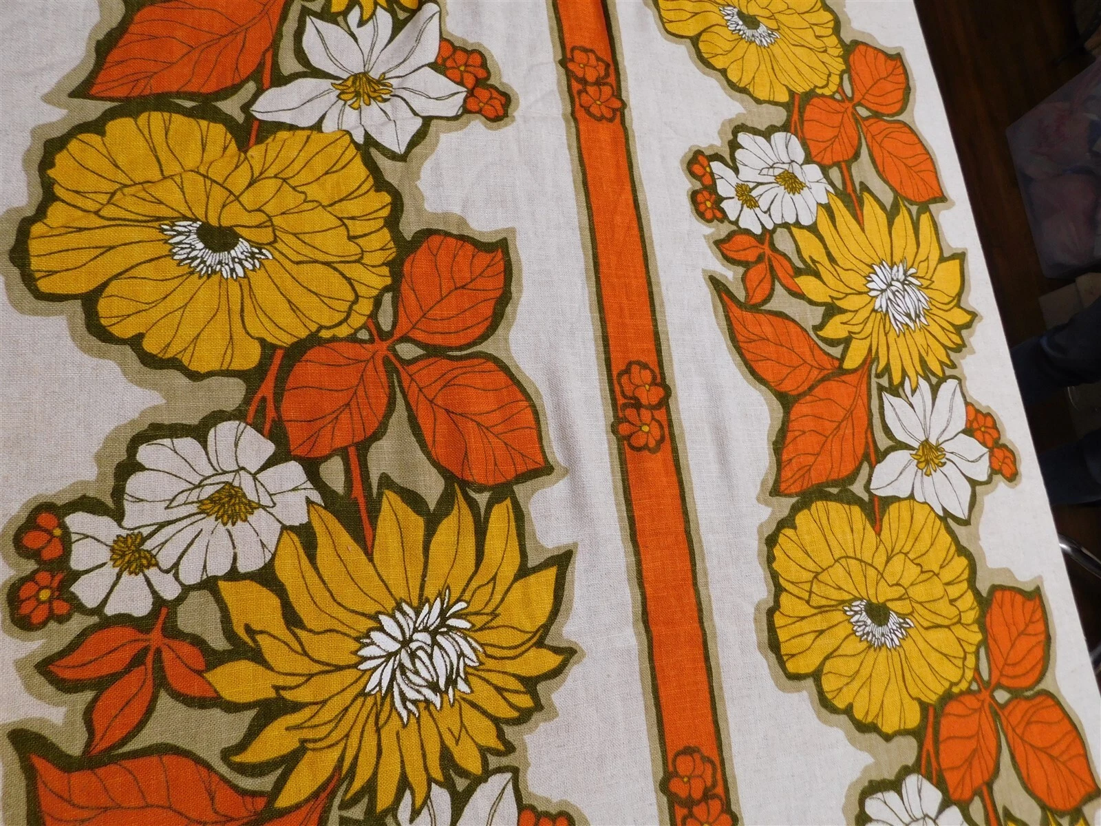 Transform your living space with this stunning vintage fabric from the 1970s! This bold floral print features vibrant shades of orange, yellow, and gold, capturing the essence of the MOD era. Perfect for creating eye-catching curtains, upholstery, or other home decor projects, this fabric is sure to add a burst of color and personality to any room.