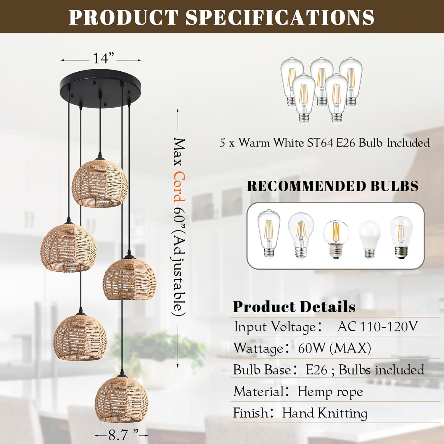 - Dimensions: Lampshade diameter of 8.7″, ceiling plate diameter of 14″, with adjustable hanging cords up to 60″.