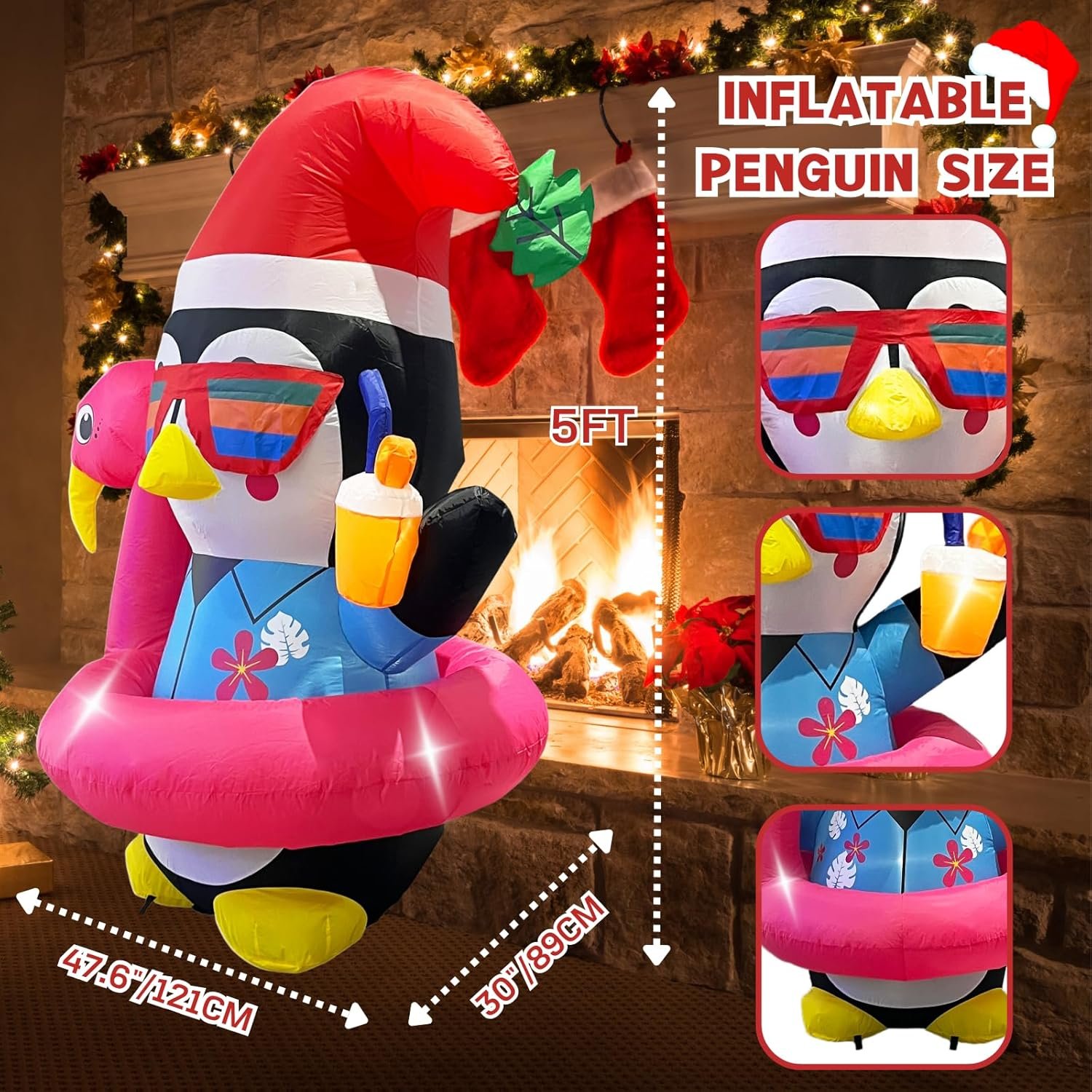 - Cute Design: 5FT inflatable penguin featuring a flamingo swimming ring, sunglasses, and floral shirt, perfect for a tropical-themed Christmas.