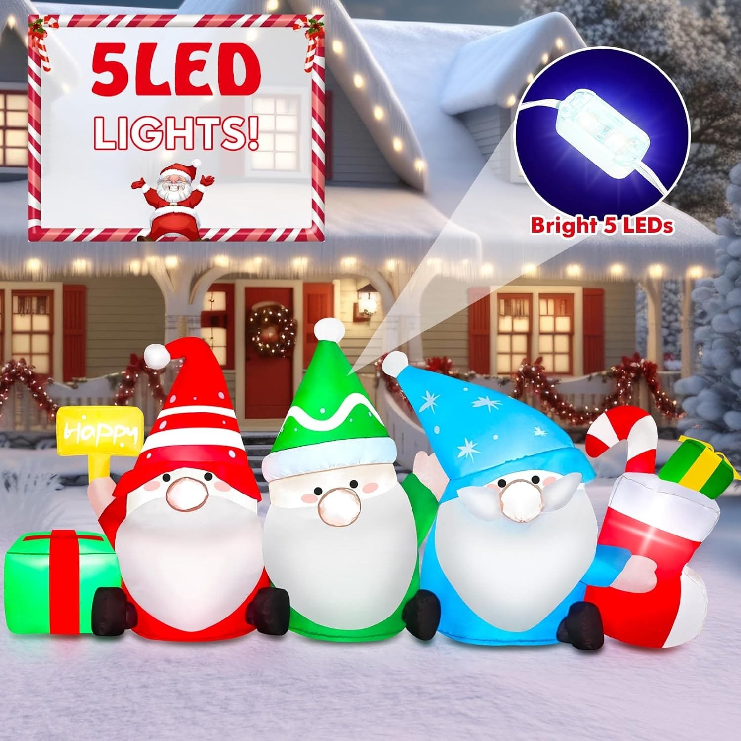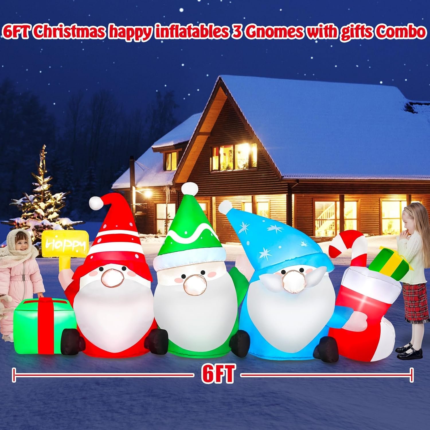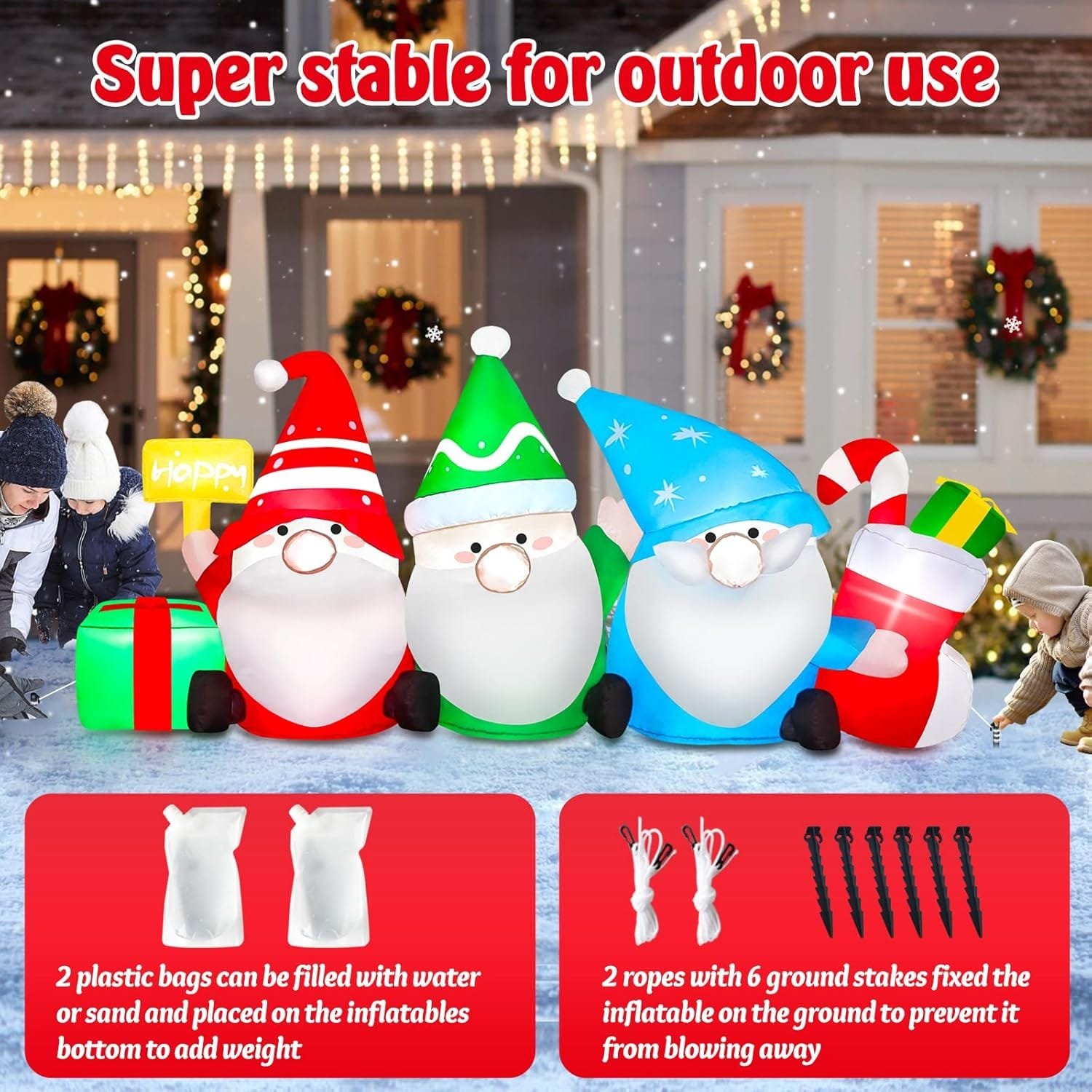 - 🌧️ Includes 6ft inflatable gnomes, blower, ground stakes, and water bags for stability in windy conditions.