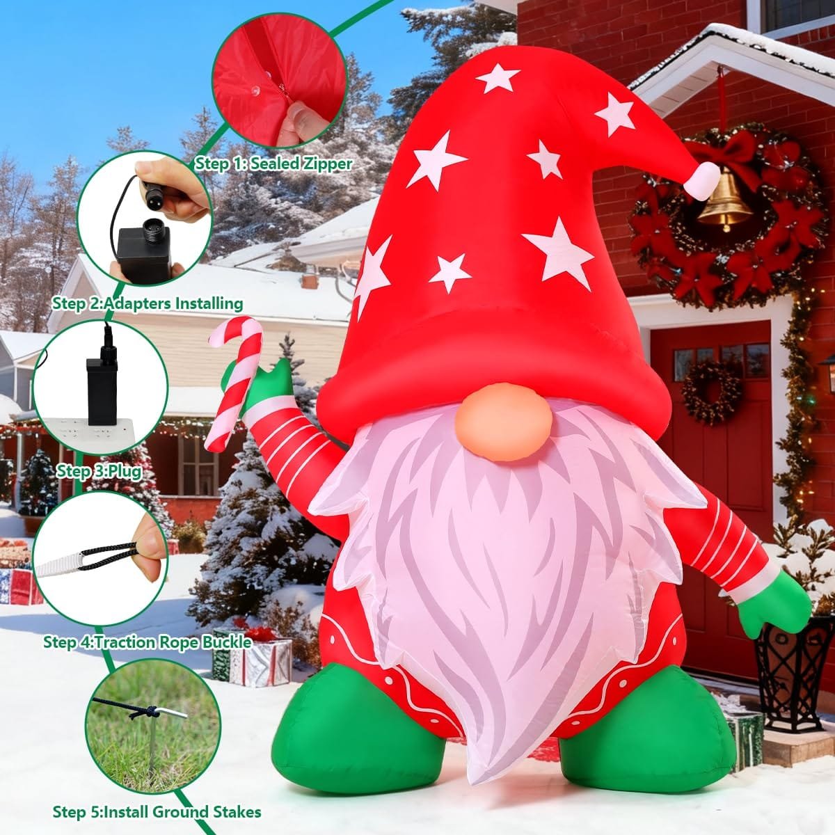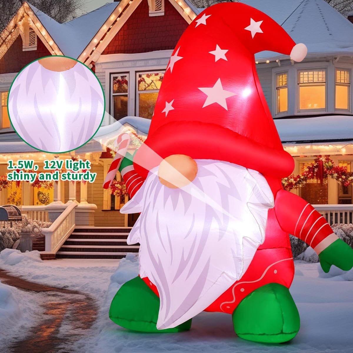 - 6FT Christmas Gnomes: Features a festive design with a Santa hat and candy cane, ideal for creating a cheerful holiday atmosphere.