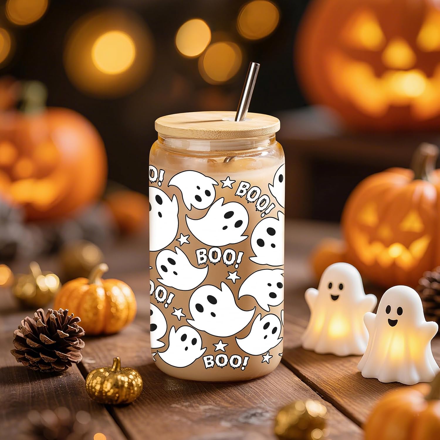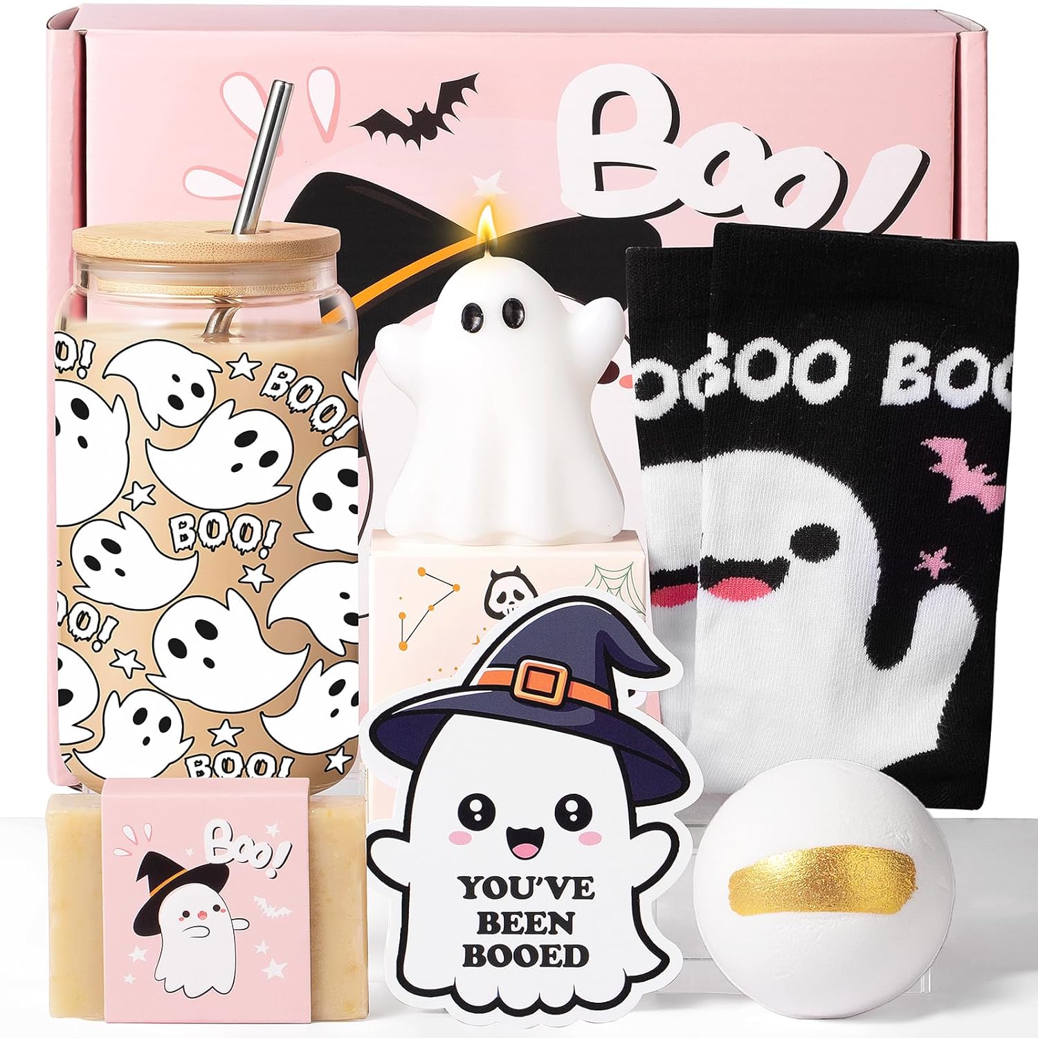 - Unique Items Included: Features a ghost-shaped scented candle, soft socks, a ghost-themed glass tumbler with straw, oatmeal milk soap, a bath bomb, and a ghost-shaped greeting card.
