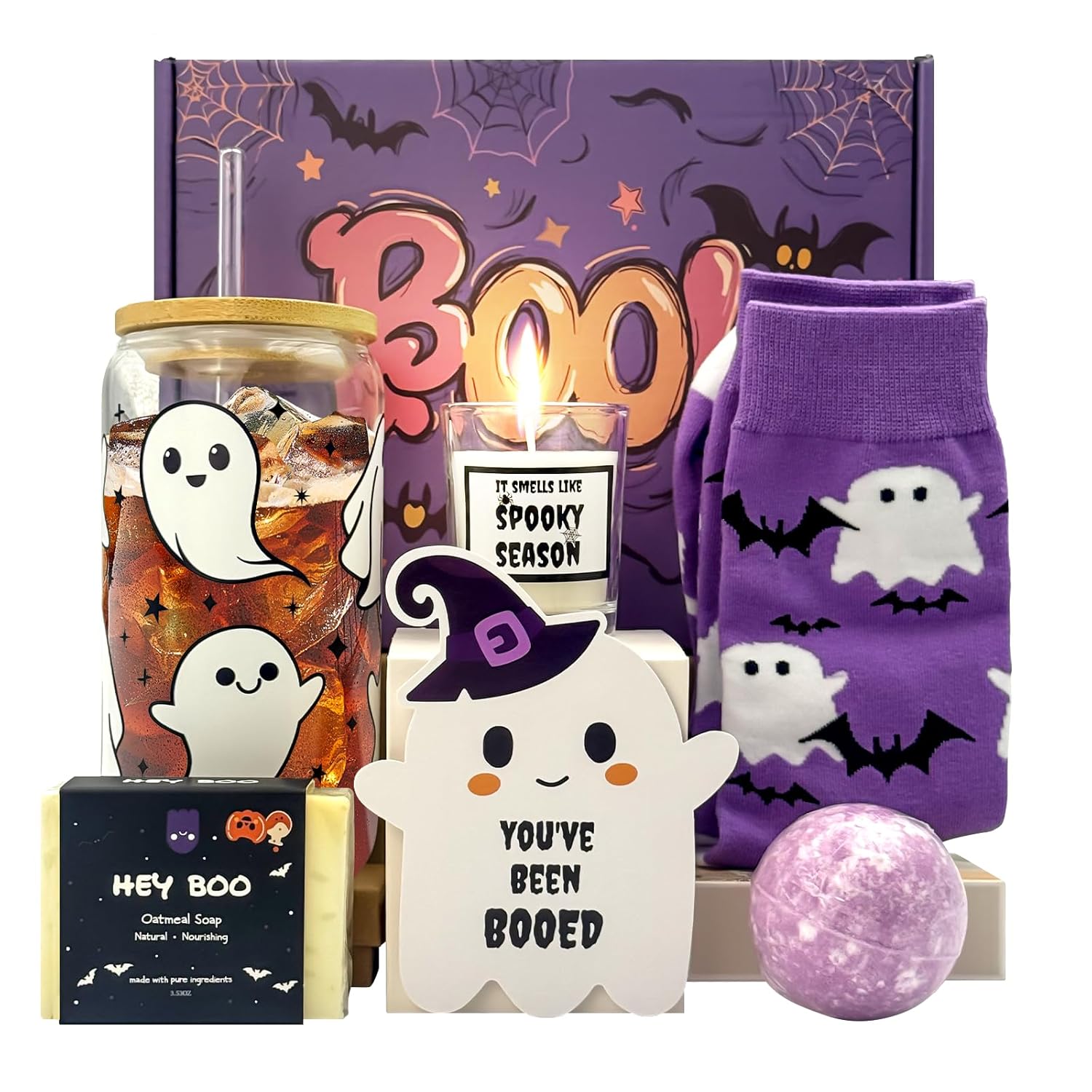 - Cozy and Fun Items: Features a lavender scented candle, cozy socks, ghost-themed glass cup, handmade oatmeal milk soap, bath bomb, and ghost-shaped greeting card.