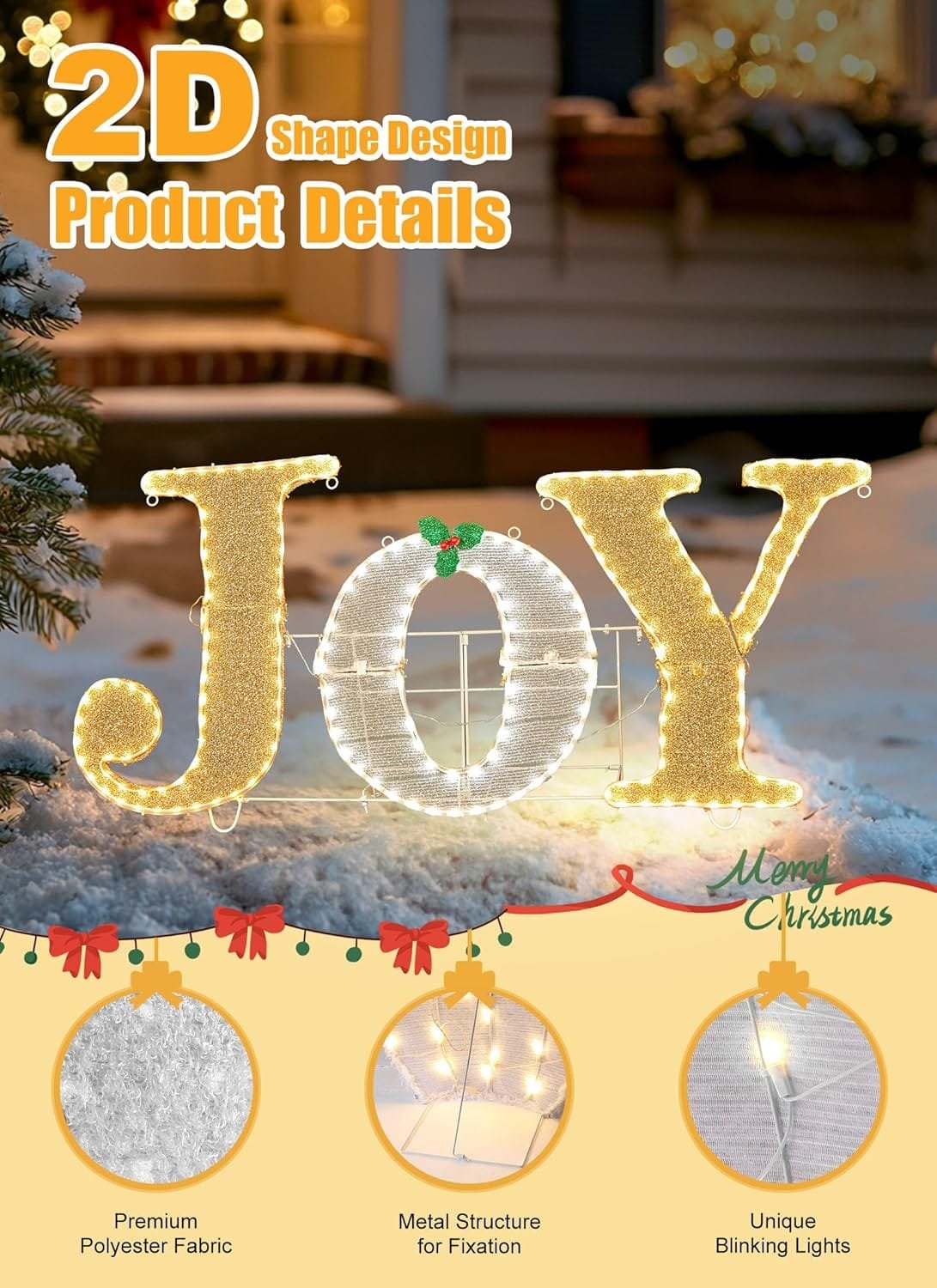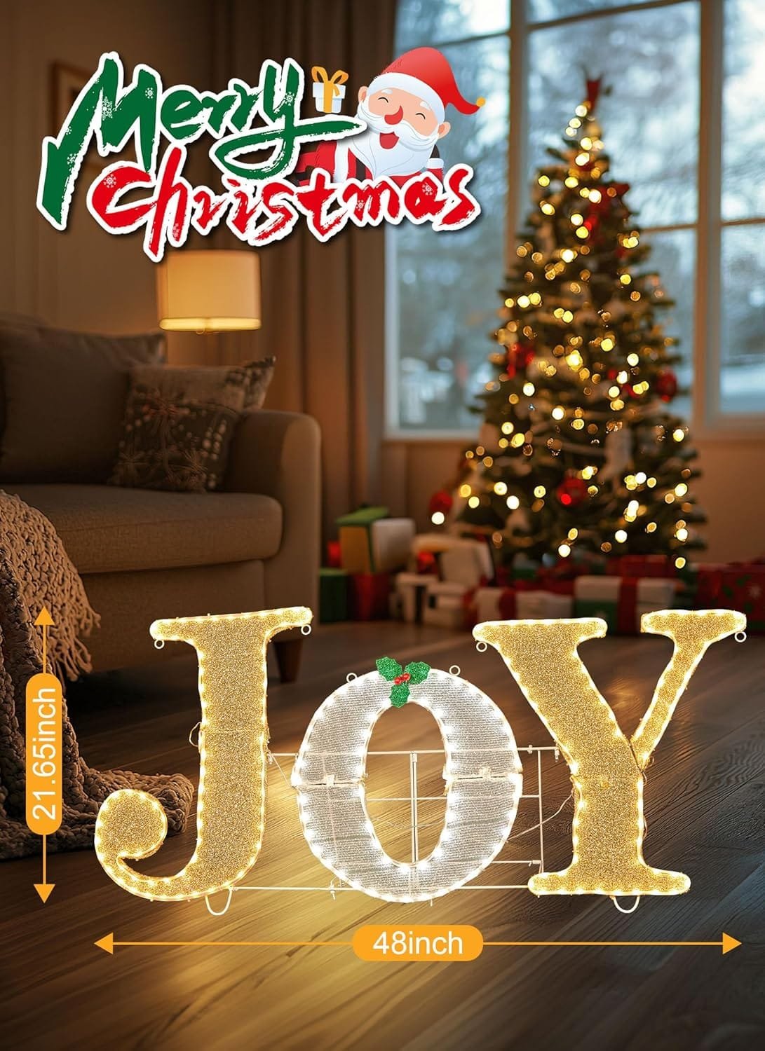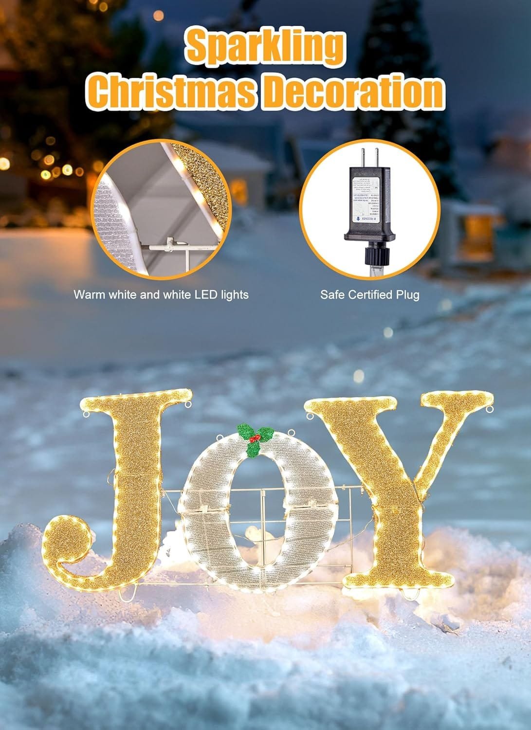 - Large Outdoor Decoration: 48-inch long JOY yard sign stands 21.6 inches high, featuring 213 warm white LED lights.