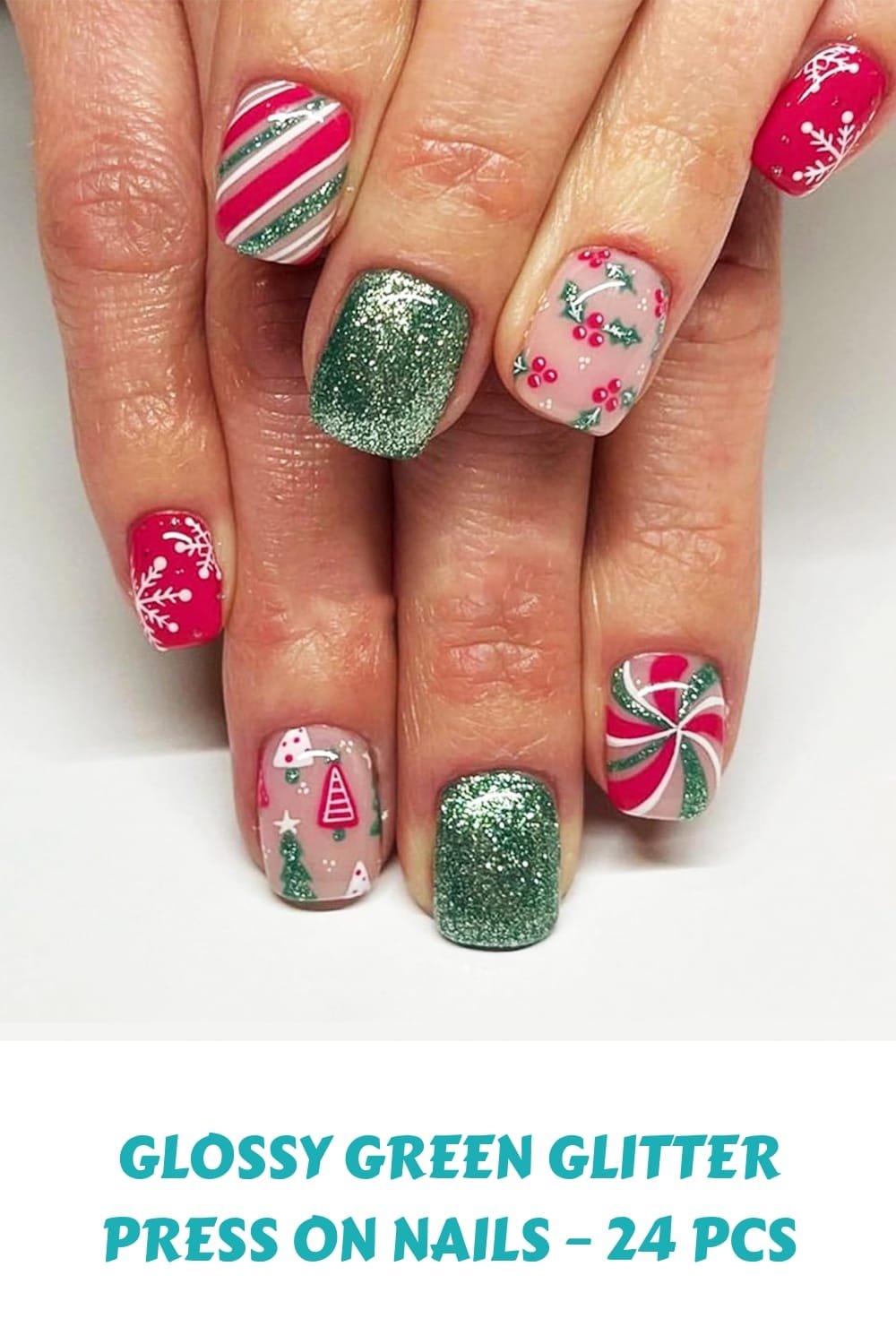 Transform your holiday look with the Holly Press On Nails by AROVFAM! These stunning, glossy green glitter nails are designed to bring festive cheer to your fingertips while ensuring you shine bright at every holiday gathering.