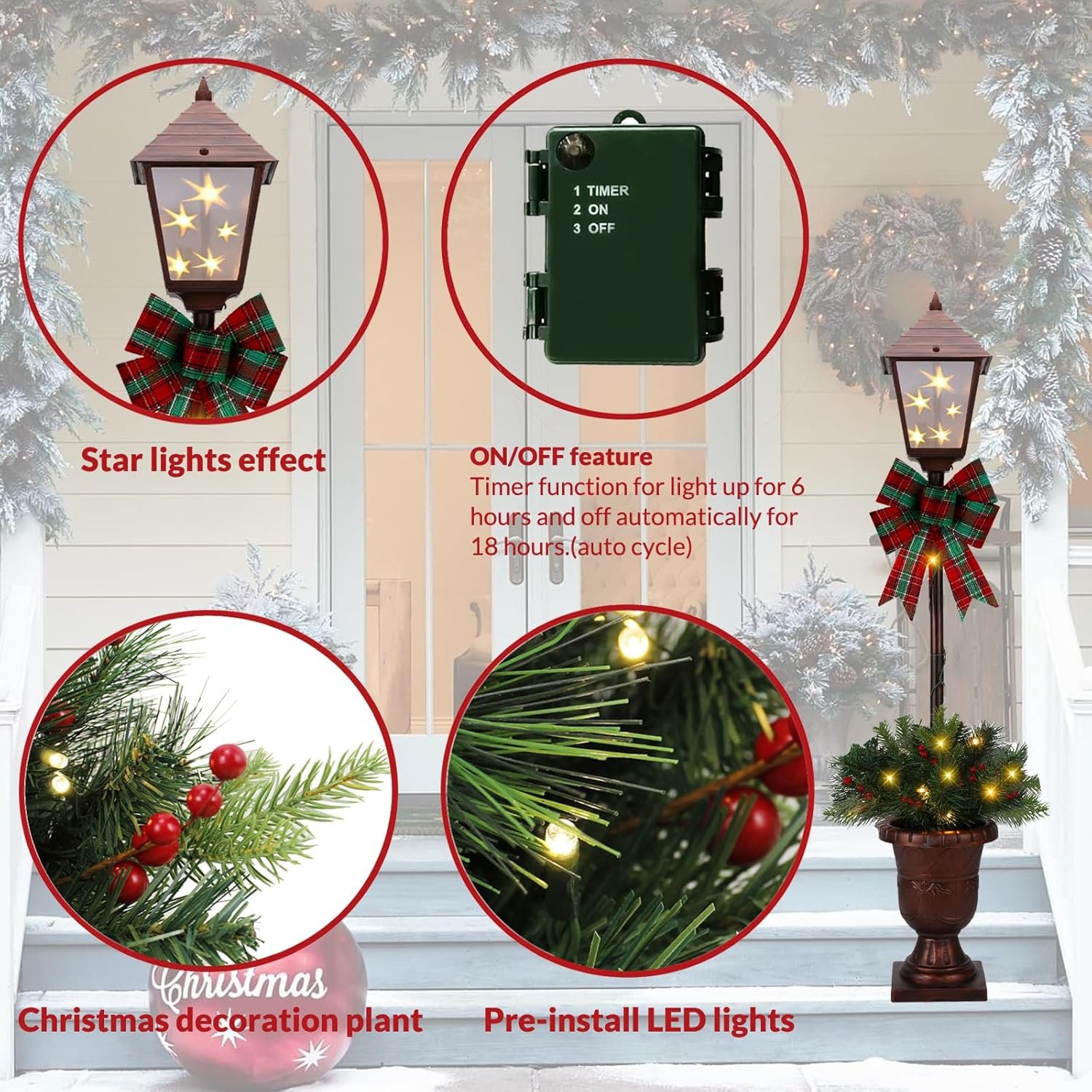- Convenient Timer: Equipped with a built-in timer, this lamp post automatically turns on and off, allowing you to enjoy the beauty of the season without any hassle.
