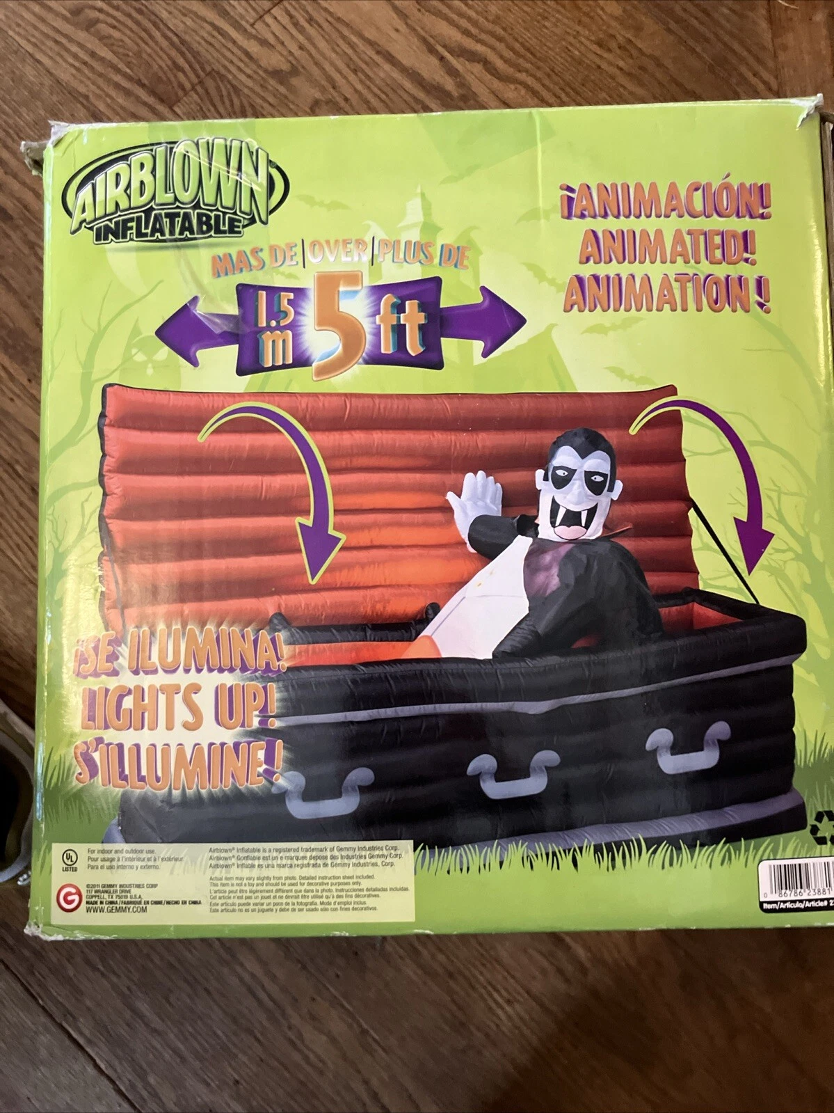 Get ready to send shivers down the spines of your neighbors with this unique inflatable vampire! Standing tall in an elegantly designed coffin, this air-blown decoration is perfect for adding a touch of the macabre to your Halloween celebrations.