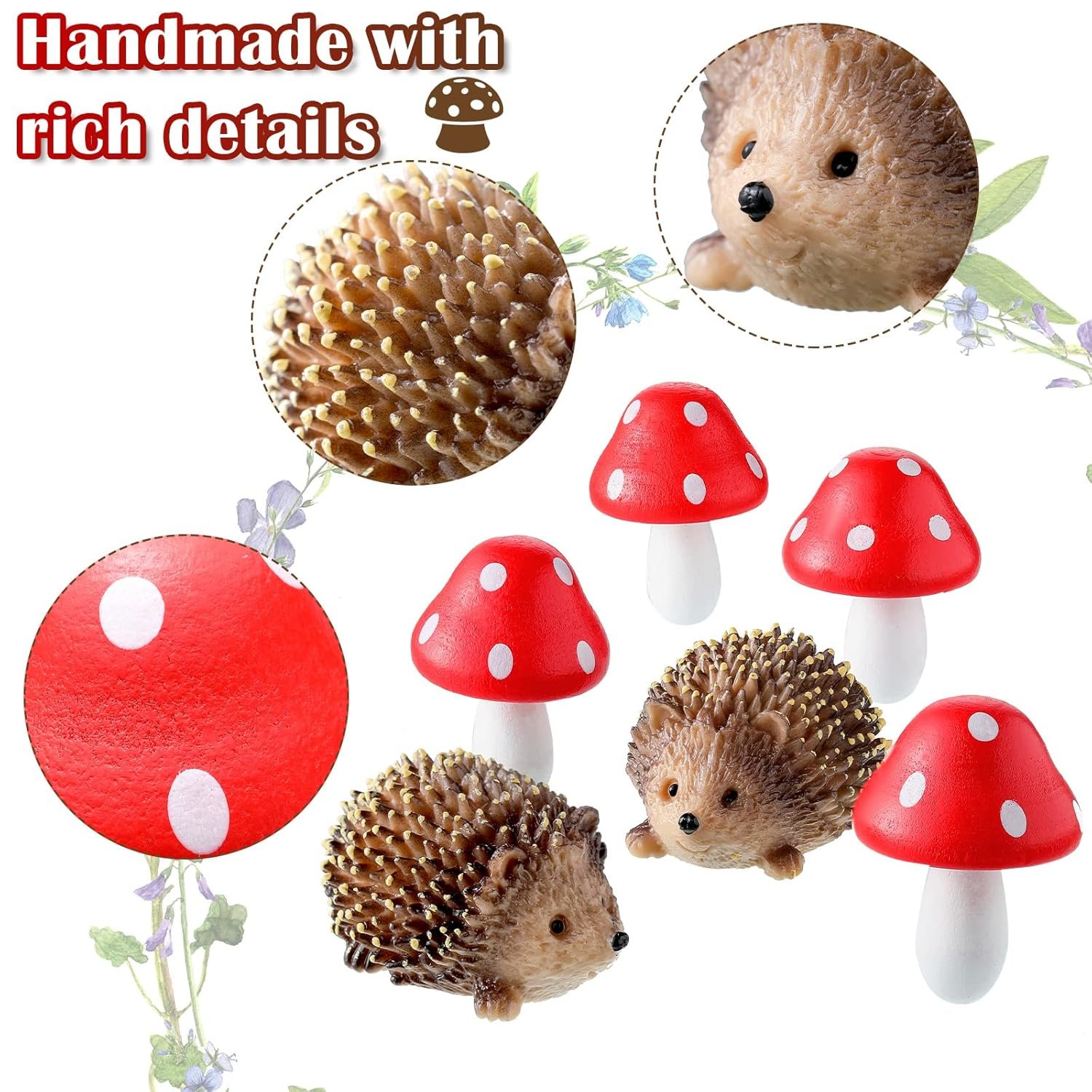- Set includes 6 handmade garden accessories: 2 resin hedgehogs and 4 wooden mushrooms.