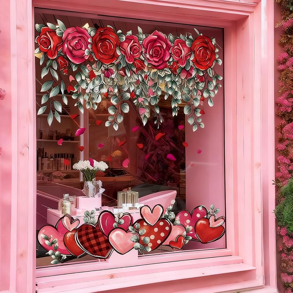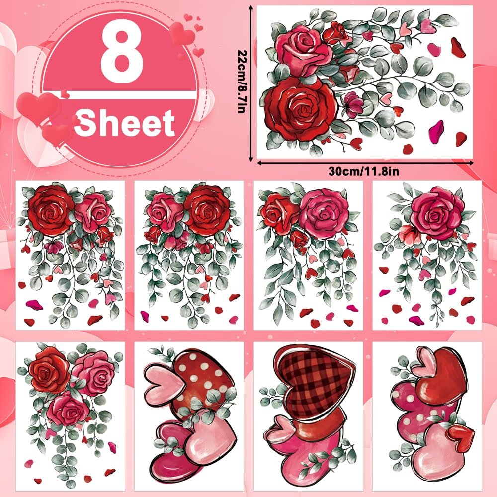 - Value Set: Includes 8 sheets of reusable Valentine’s Day window decals with classic themes like roses and hearts.