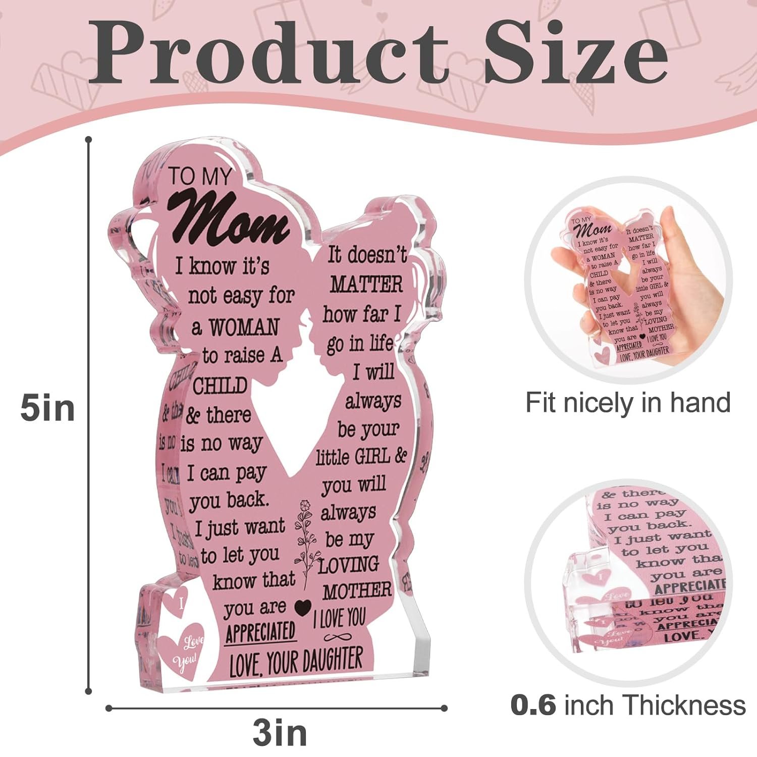 - Unique design featuring a mom and daughter hug shape, measuring 5 x 3 x 0.6 inches; can stand alone.