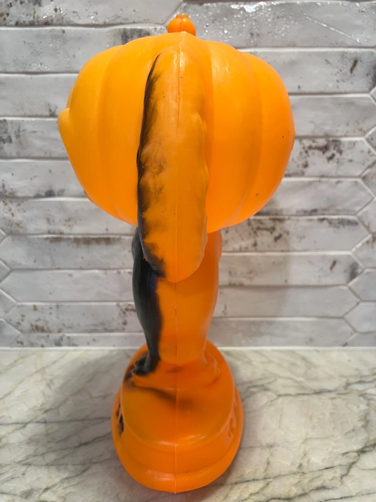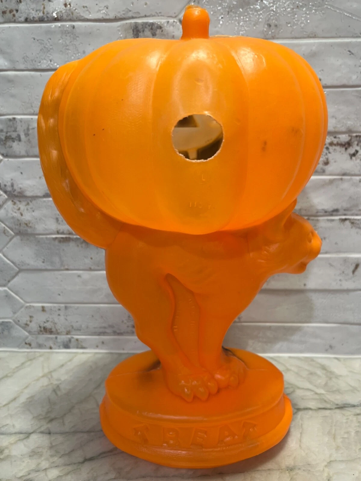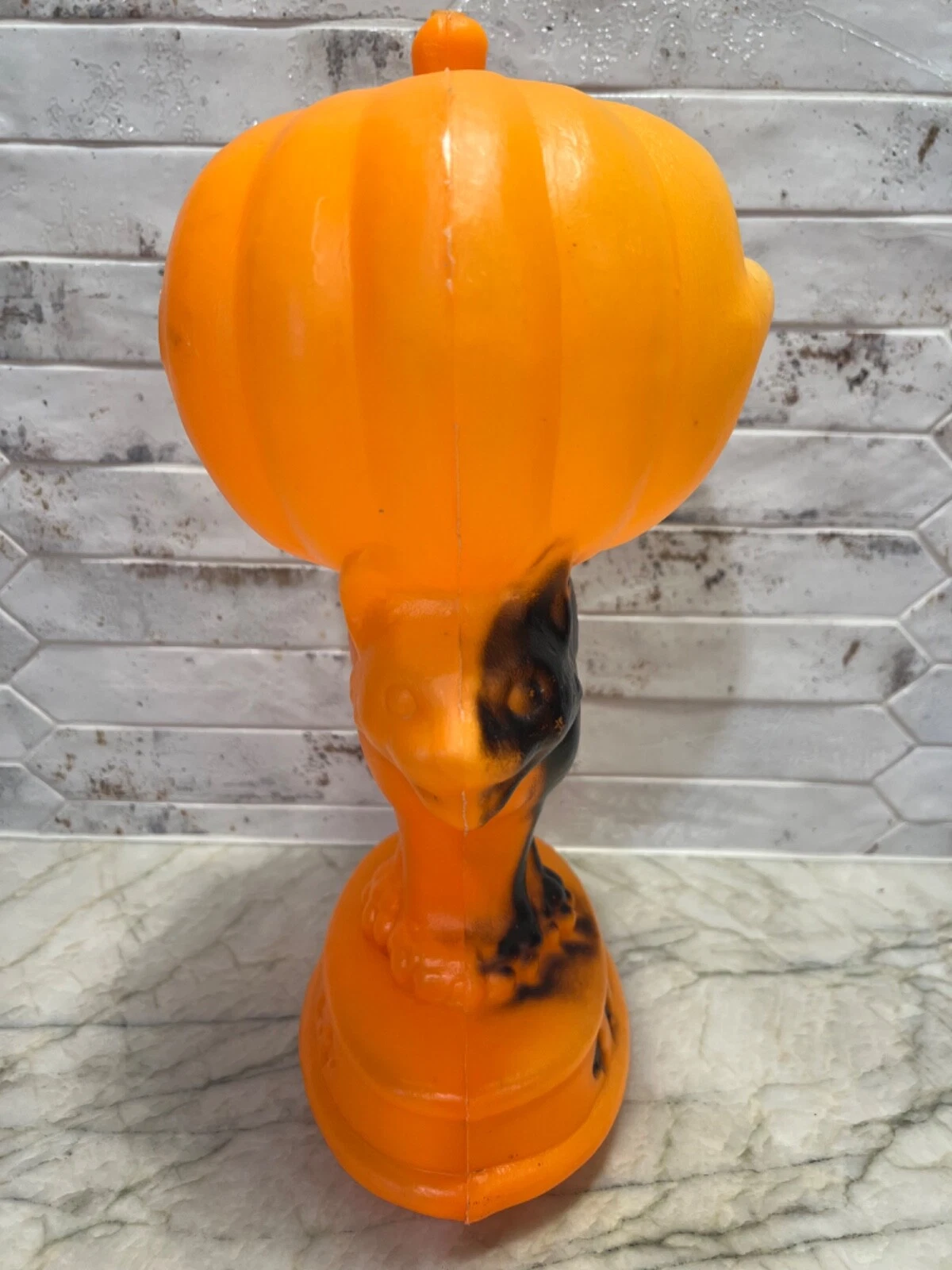 - Vintage Halloween blow mold featuring a black cat and pumpkin jack-o-lantern head