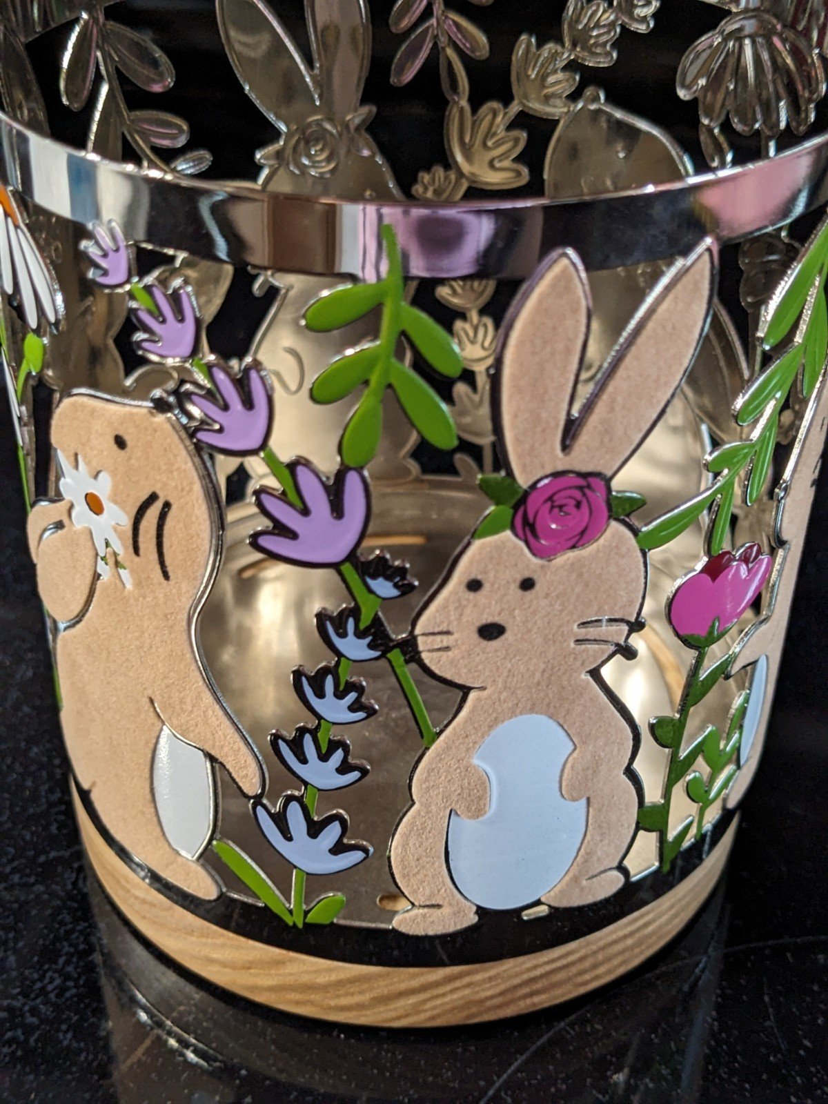 | Features | Velvet Bunnies, Gorgeous Spring Garden Colors, Matching Illuma Lid Topper, Decorative, Wooden Base |